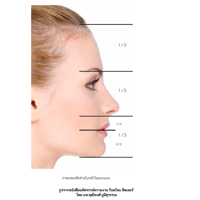 ข้อแรก สัดส่วนของใบหน้า ซึ่งก็สามารถแบ่งออกเป็น 3 ส่วนเท่าๆ กัน นั่นก็คือ ส่วนบน ส่วนกลาง และส่วนล่าง และตัวคางจะมีความยาวประมาณ 2 ใน 3 ส่วนของส่วนล่าง สามารถดูรูปประกอบเพิ่มเติมได้