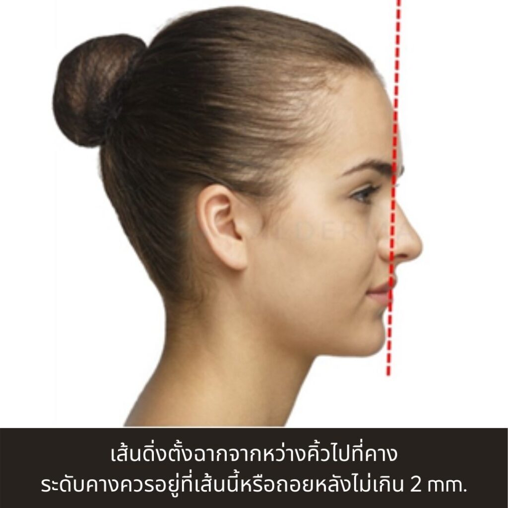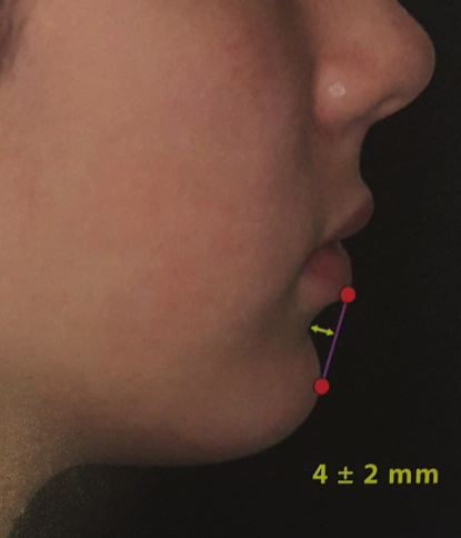 ข้อสาม ส่วนของร่องเหนือคาง และตัวริมฝีปาก เมื่อเรามองจากด้านข้าง 90 องศาแล้ว ร่องระหว่างคางกับริมฝีปาก จะอยู่ที่ประมาณ 4 มม. บวกลบได้เล็กน้อย เพราะร่องนี้ก็มีความสำคัญ ต่อรูปคางมากๆ (ดูรูปประกอบ) ซึ่งการฉีดในบางเคสบางรายเอง ก็จำเป็นต้องแก้ไขร่องบริเวณนี้ด้วยเช่นกัน นอกจากนี้ หากเราลากเส้นแนวดิ่ง จากหน้าผากบริเวณหัวคิ้วลงมา ระดับคางควรอยู่แนวเส้นนี้ หรืออาจจะถอยหลังไม่เกิน 2 mm หากคางอยู่หลังเส้นนี้มากๆ ถือว่าคางสั้นถอย และหากระดับเกินเส้นนี้ จะถือว่าคางยื่น